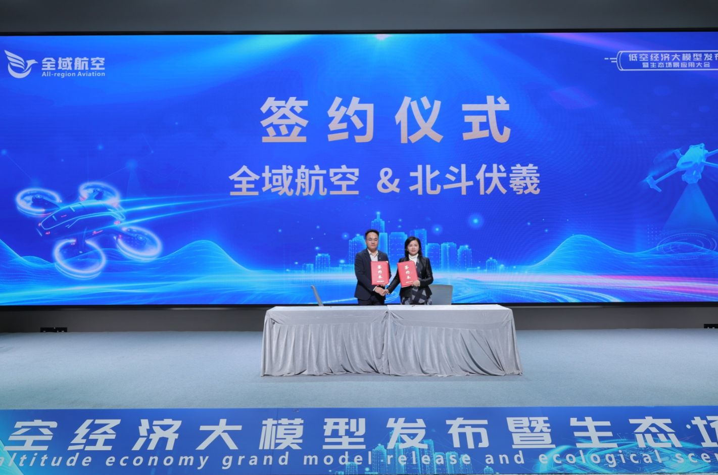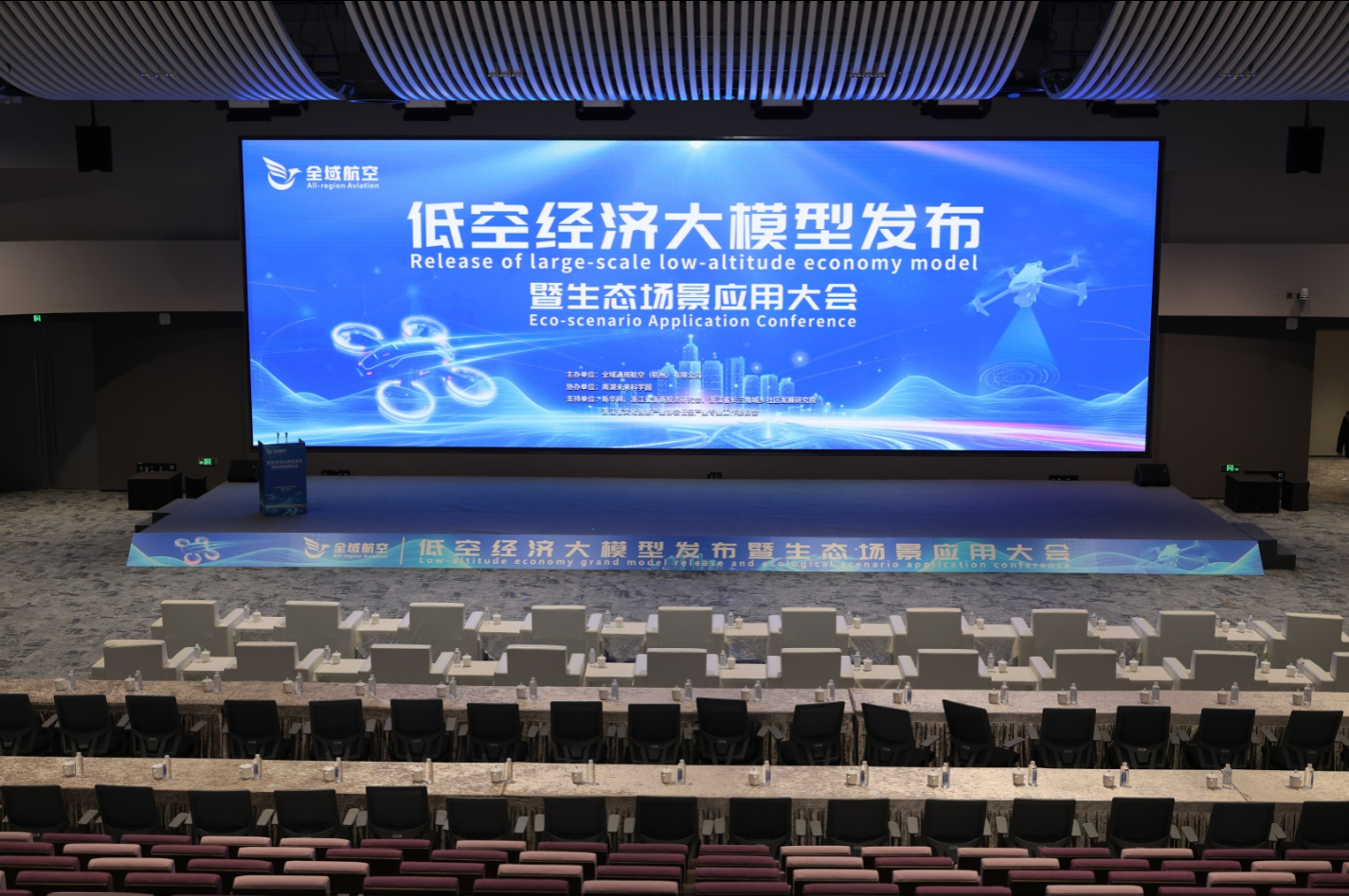 在全场嘉宾瞩目下,董事长曹洺、新华网低空经济研究院秘书长李明、杭州低空无人机运行服务中心副主任王仁国、全域航空首席科学家毕思文、浙江省浙商投资研究会战略委员会主席屠仁华、浙江文化创意协会低空经济专委会主任蓝伟林、军创集团秘书长付家亮、浙江省低空安全管理协会副秘书长李建华、中建五局城市运营公司副总经理王荣晖登台,共同启动低空经济大模型发布仪式。随着启动装置点亮,标志着公司低空经济智能化发展迈入全新阶段。