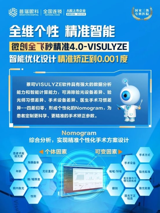 全飞秒精准4.0的全名是微创全飞秒精准4.0-VISULYZE(以下简称为全飞秒精准4.0),是基于全飞秒的Nomogram精准解决方案之上,帮助医生优化手术方案设计,帮助患者增强术后视觉质量。