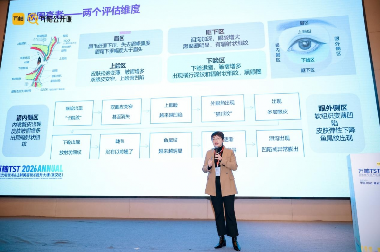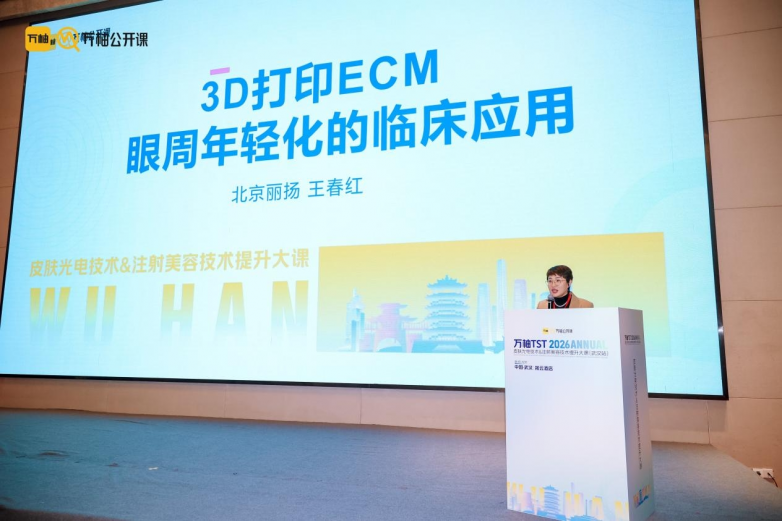 1月20日,万柚TST 2026皮肤光电技术&注射美容技术提升大课(武汉站)圆满举办。作为国内医美抗衰领域的权威盛会,本次大课聚焦前沿技术落地与临床实战交流,北京丽扬医疗美容院长王春红受邀重磅授课,以《3D打印ECM在眼周年轻化的应用》为题,结合其二十余年工作积淀与海量临床案例,深度解析眼周抗衰痛点与创新解决方案其技术与独到见解引发现场共鸣。