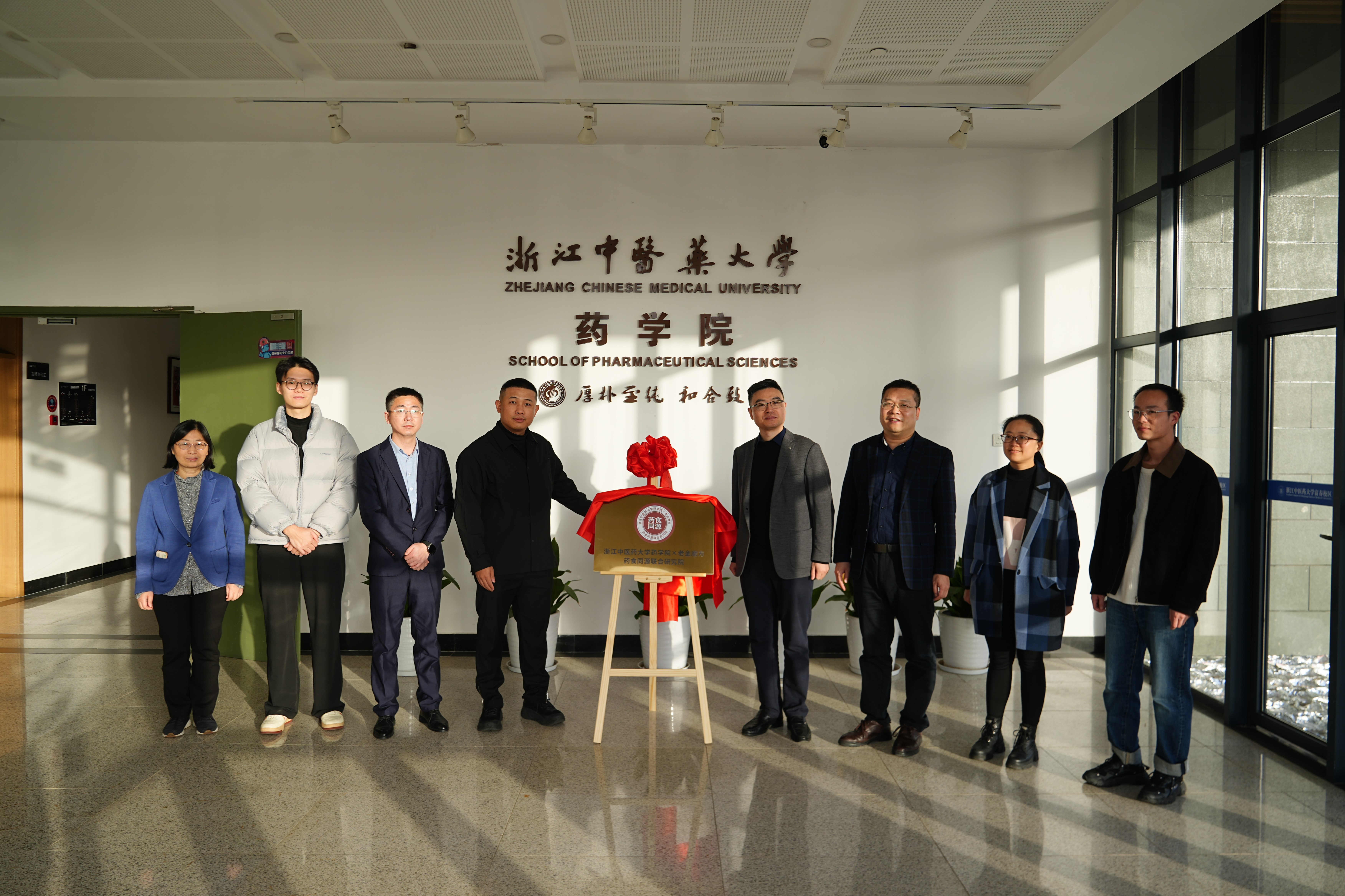 浙江中医药大学药学院副院长曹岗、教授甘礼社、科教办主任楼招欢、老金磨方品牌总监刘月泽、产品总监陈靖文、生产负责人赵凯等人员共同揭牌