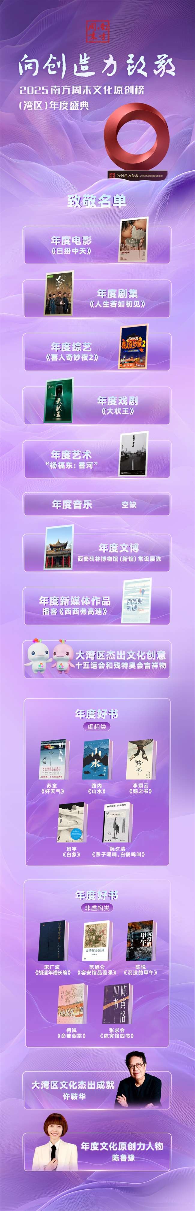 致敬原创力量,记录文化进程。2026年1月24日下午,南方周末文化原创榜(湾区)年度盛典在广州举办,向2025年具有创新力、洞察力和生命力的作品、创作者致敬。活动现场,各项荣誉悉数揭晓。