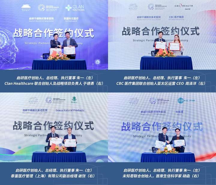 在实现技术跨越与服务升级的征途中,启研医疗在本次盛会上迈出了坚实一步,正式与来自中国、美国、英国、德国的四家全球顶尖科研机构达成战略合作。通过整合英国Clan Healthcare、德国CBC医疗集团、美国Draco Natural Products及未知君的国际化科研力量,启研医疗将深度布局精准营养干预、细胞代谢管理、植物活性成分应用及肠道微生态预防等前沿领域。这一系列强强联手,标志着启研医疗正通过链接全球顶尖的研发智慧,构建起一套从底层科研到临床应用的闭环体系,致力于将世界级的增龄医学方案转化为守护中国居民健康的实效路径。
