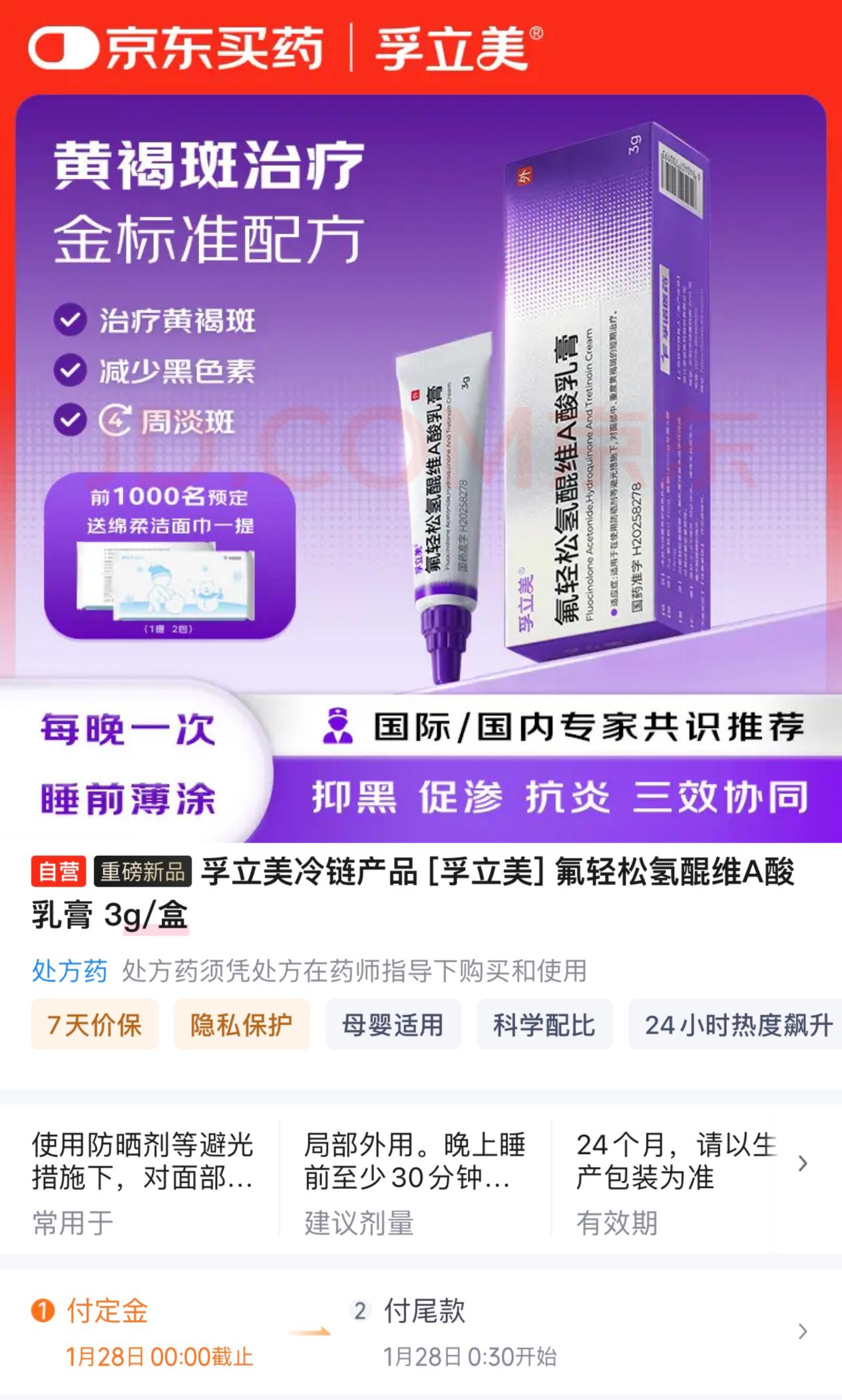 被众多皮肤科医生称为“斑中之王”的黄褐斑,其规范治疗终于迎来清晰、可及的标准化选项。国内首款严格遵循国际黄褐斑治疗“金标准”(Kligman三联疗法)研制的处方药——孚立美®(氟轻松氢醌维A酸乳膏),已于京东健康平台正式开启预售。患者现可通过京东APP搜索“孚立美”,访问专题页面锁定预约资格。