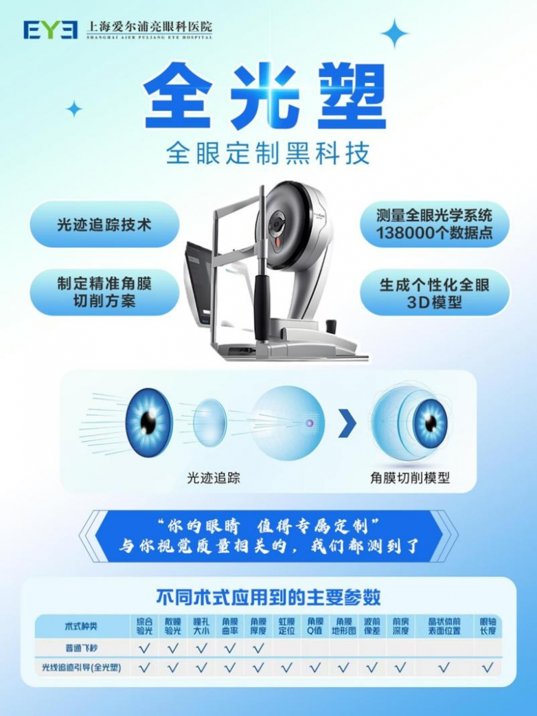 上海爱尔浦亮眼科医院始终将患者需求放在首位,技术升级全程与规范化诊疗流程同频共振。微创全飞秒精准4.0通过系统性减少验光偏差、设备差异及个体操作变量,有效降低视觉波动风险,保障术后屈光结果的长期稳定;全光塑技术则从眼部整体视觉系统出发,综合考量角膜形态与眼内光学特征,实现更具针对性的精细矫正。