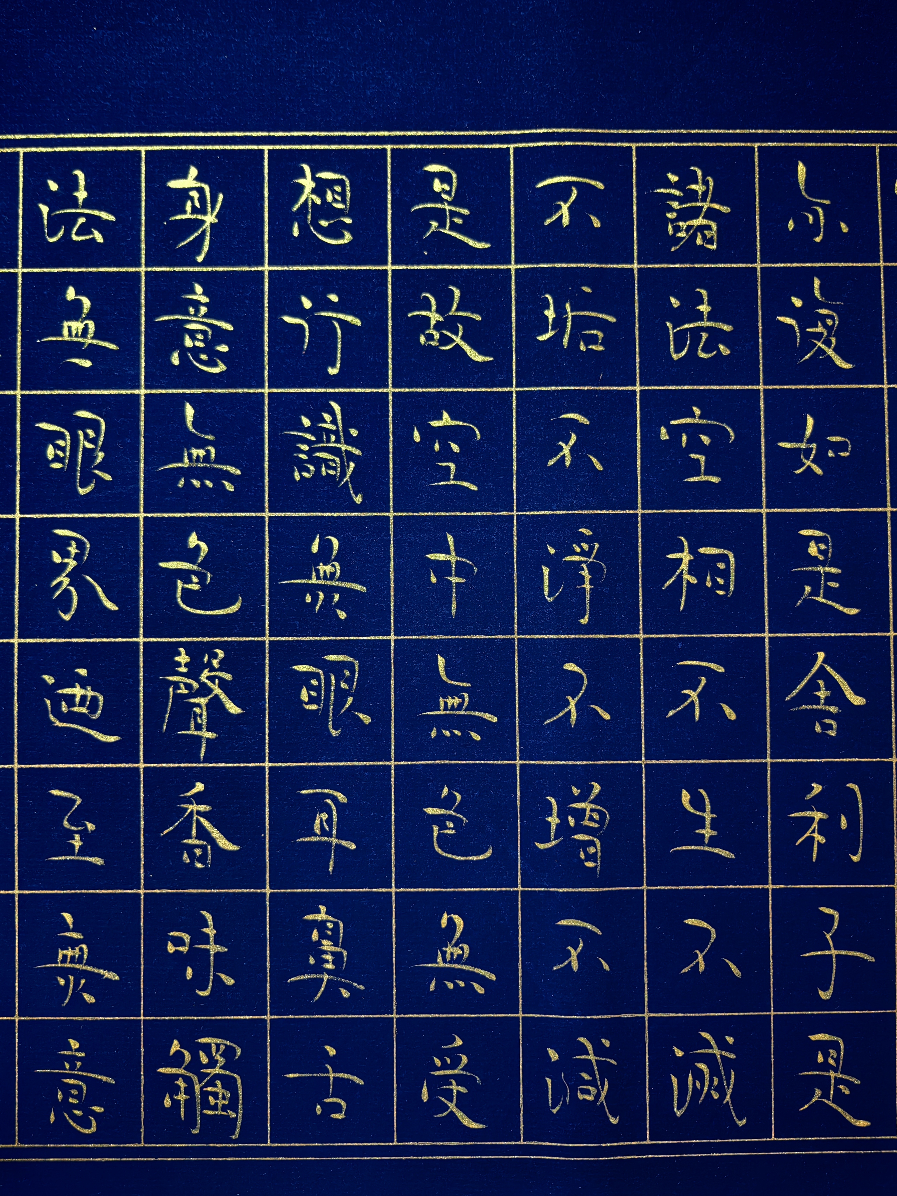 在北京一间充满文人气息的工作室内,胡家喜先生正悬腕运笔,深蓝方格笺上金墨流光。随着笔锋起落,《心经》经文如莲绽放,墨色凝香间禅意流淌——这幅作品,正是他独创“道虚体”书风的精妙呈现。