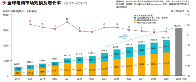 当前,全球B2C电子商务市场在庞大基数上继续保持增长韧性。根据transcosmos《2025全球电商手册》的数据,2024年全球市场规模已达约7.4963万亿美元,同比增长显著。但是,增长并非均质分布。行业高速增长阶段已基本结束,市场整体进入更为平稳、理性的扩张通道,尤其在欧美等成熟市场,增速放缓趋势明显。报告预计未来该市场将以年均7.6%的增速持续扩大,至2034年规模有望达到15.5692万亿美元。