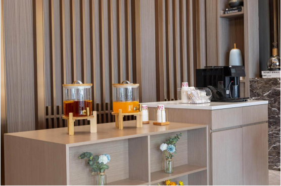 进入大堂,改造团队首先着手优化过于沉重的大理石元素,通过加装墙板、艺术贴膜等低成本方式,快速扭转了空间基调。对于体量较大的原有前台,并未简单拆除,而是采用拼贴改造的方式,使其与全新背景墙融合,形成了统一且现代的视觉体系。同时,撤换旧款沙发,植入品牌标准化的鲜亮家具组合,迅速点亮了空间氛围。值得注意的是,大堂引入了自助售卖柜、饮吧、智能机器人及酒店好物展示区,显著增强了空间的功能性与体验层次。