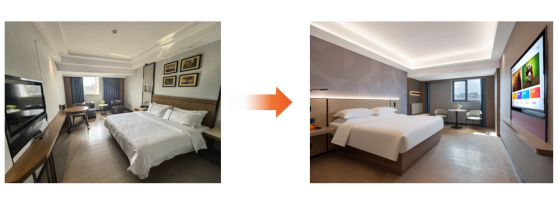 客房改造的核心逻辑是“体验做加法,成本做减法”。针对原有客房家具零散、色调沉闷的问题,改造秉持“减负”理念,通过保留主体结构、对床箱、桌面、天花等部位进行贴膜翻新,在实现视觉焕然一新的同时,大幅节约了成本。例如,经评估后保留原有优质床垫,有效控制了核心投入。此外,针对临街客房隔音痛点,以增设隔音条等“微改造”巧妙解决了噪声问题,体现了低成本提升核心体验的智慧。