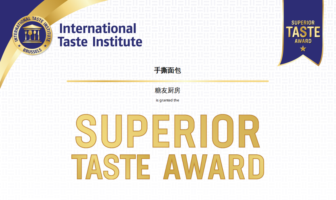 近日,国内控糖食品销量第一品牌“糖友厨房”宣布,其主打产品低GI手撕面包凭借出色的感官品质与风味,荣获由International Taste Institute(国际风味评鉴所)颁发的“国际美味奖”(Superior Taste Award)。