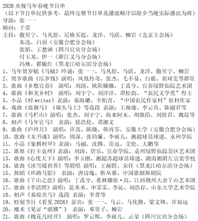 马年春节日渐临近,随着马年春晚第二次大联排的完成和第三次彩排的进行,跨界农文旅体康等多领域的资深文旅专家、首位执导春晚的80后导演张一一和体制外主持人“话题女王”柳岩主持马年春晚的相关话题持续发酵,马年春晚的关注度也越来越高,虽然还有一些神秘嘉宾和“秘密武器”由于保密原因秘而不宣没有被外界拍到,但犹抱琵琶半遮面的马年春晚的一些精彩看点亮点还是顺藤摸瓜有迹可循渐次浮出水面,随着央视主持人朱迅和张韬近日分别现身安徽合肥和四川宜宾,敬业的媒体记者、海淀大妈、现场舞蹈演员、化妆师、央视勤杂人员和参加第一次、第二次彩排的现场观众和分会场网友也陆续推测出了2026丙午马年春晚的主持人阵容(含黑龙江哈尔滨、安徽合肥、四川宜宾、浙江义乌四地分会场)和部分春晚节目单如下: