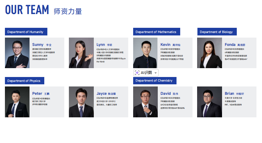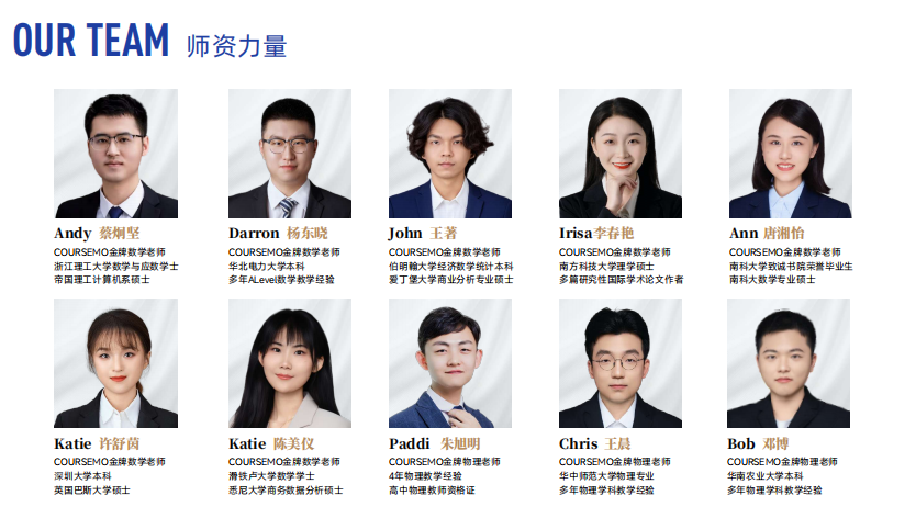 团队中既有像Allie胡瑞真(剑桥大学教育学哲学硕士)、Yumi邓昱旻(剑桥大学本科)、Brain林翰轩(牛津大学本硕)、Andy蔡炯坚(帝国理工硕士)、Daniel梅诺诚(伦敦大学本科)、John王著(伯明翰大学本科、爱丁堡大学硕士)、Albert黄舰逸(香港大学本硕)、Ivy王睿萌(美国东北大学硕士)这样拥有世界顶级学府学术背景的导师;也有如Darron杨东晓、Chris王晨等教学经验丰富深耕A-Level学科多年的实战派教师;还有Dr. Will(前剑桥大学招生官/面试官)、Samara Shahjahan(剑桥大学医学生)等构成的外教及海外导师团队,为学生带来原汁原味的学术视角与升学指导。