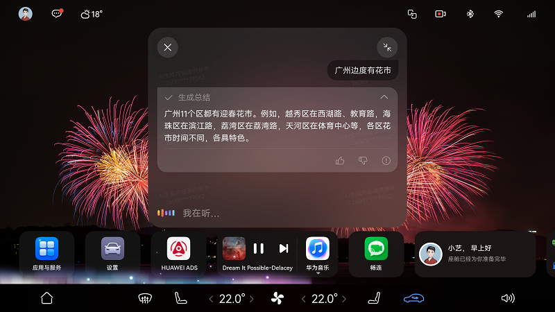 归家途中,想来点亲切的乡音,小艺也能温柔接住你的思乡情绪。升级后的车载小艺能听懂多种方言,比如旅途中的所见所闻可以用粤语跟小艺聊:“广州边度有花市?”也可以用四川话问小艺“前面的山是什么山?”历史人文、食肆餐饮、沿途美景,随时随地用乡音和小艺开启畅聊,让每段旅途兼具舒适与收获。