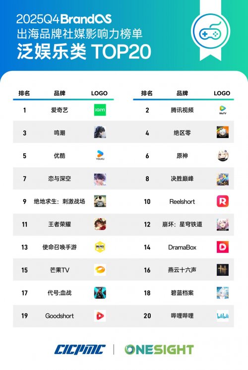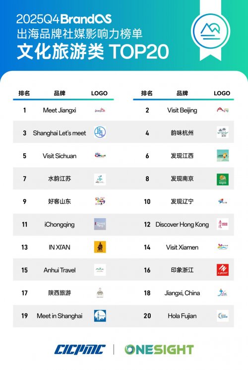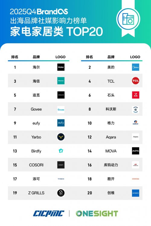 近日,由中国品牌出海领导者 OneSight 与中国国际跨国公司促进会(CICPMC)联合发布的 2025Q4 《BrandOS 出海品牌社媒影响力榜单》正式上线。该榜单由 OneSight 编制发起、跨国会监制,并基于 OneSight 百亿级在海外社媒与海外舆情大数据上的特有优势,从账号影响力、内容互动度、创作能力等多个维度进行评估,力求全面呈现中国品牌“走出去”过程中的数据性成果。