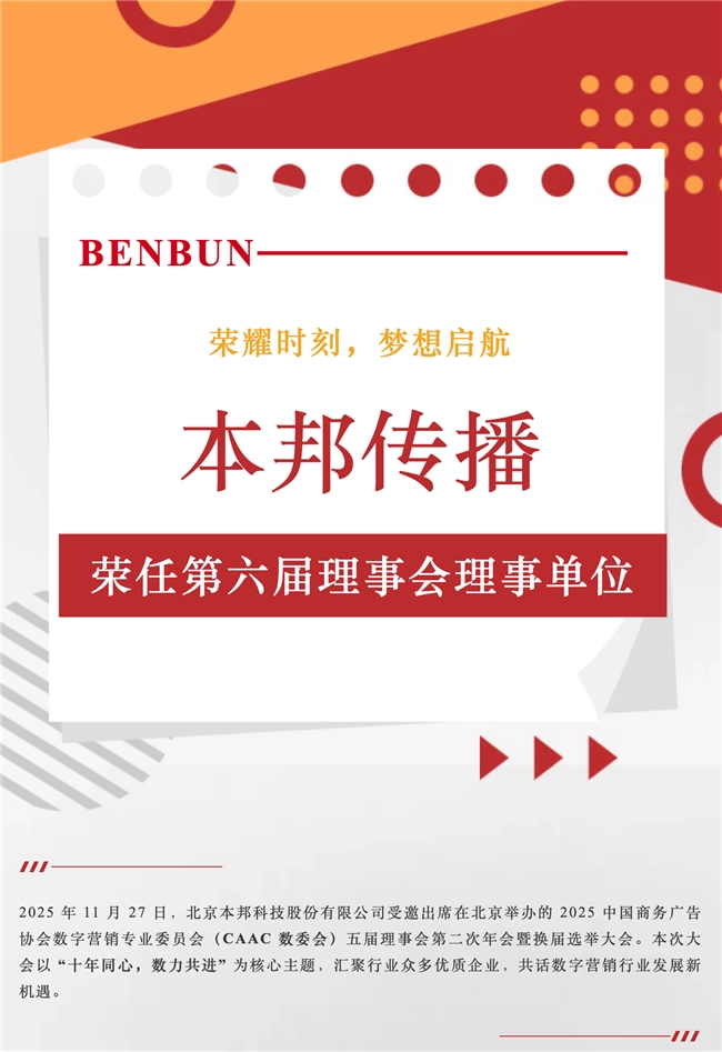 作为营销行业的一员,本邦积极参加行业的交流,北京本邦科技股份有限公司凭借在数字营销领域的专业实力与良好行业口碑,成功当选为CAAC 数委会第六届理事会理事单位,这一荣誉不仅是对本邦传播过往发展的肯定,更是对其未来在行业内发挥更大作用的期待。