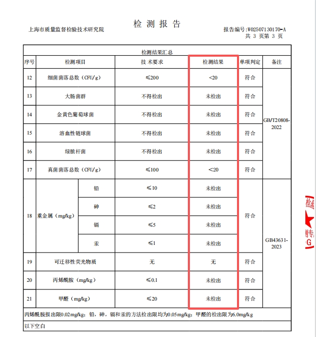(来源:上海市质量监督检验技术研究院《可心柔保湿纸检测报告W02507130170-A》)