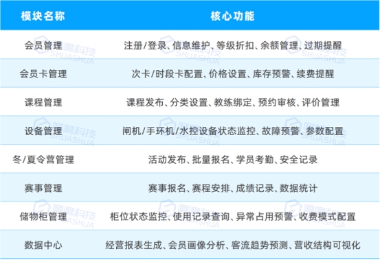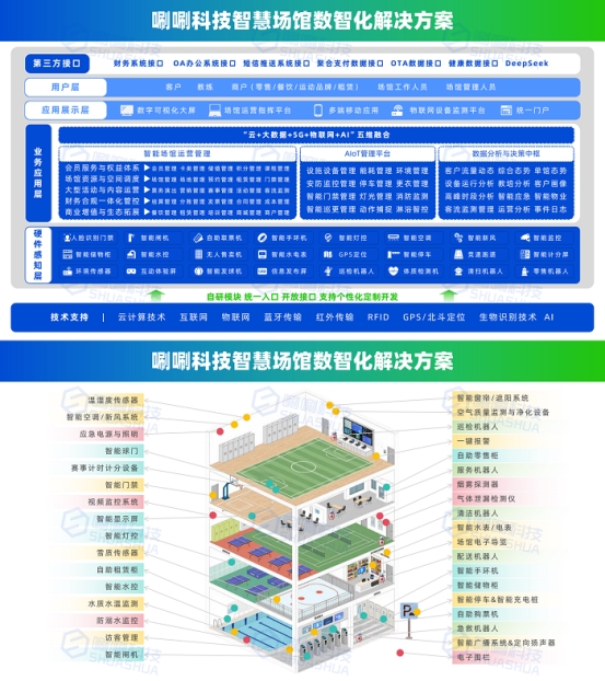 唰唰科技智慧游泳馆全场景数智化管理平台,以物联网、AI人工智能及大数据分析技术为核心支柱,构建起“感知-分析-决策-执行”的闭环式技术架构。平台深度覆盖会员日常游泳、散客服务、学员课程、冬/夏令营、专业赛事等核心业务场景,通过软硬件一体化设计实现业务流程的端到端数字化重构。