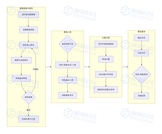 比赛当天选手入馆时,支持扫码、刷身份证、人脸识别等多种方式快速核验身份,保障入场秩序与安全。入场后,选手可在手环机前通过扫码或刷脸的方式领取手环,后续凭手环开启储物柜进行物品存放,并使用淋浴设施。比赛过程中,系统凭借标准 API 接口与专业计时系统无缝对接,实现成绩的实时精准采集、快速上传以及便捷查询,确保赛事成绩的及时性与准确性。