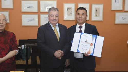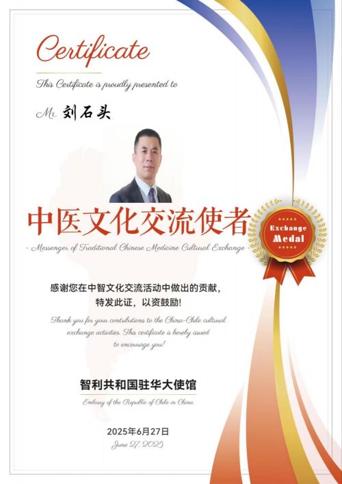 (图6:智利驻华大使馆向华夏药王董事长刘石头先生授予“中智文化交流使者”荣誉证书)
