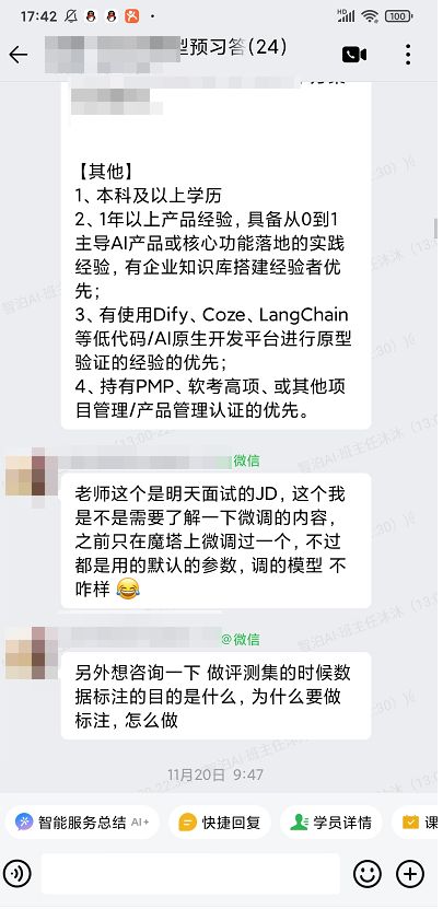 11月中旬,一位学员在智泊AI群内紧急求助:周五即将参加一家保险公司的面试,岗位核心是负责智能客服的搭建与算法团队对接,涉及多轮对话等复杂场景。他毫无保留地分享了其中细节,并向讲师抛出核心问题:“老师在这方面有什么建议?”“需要从哪几方面着手准备?”