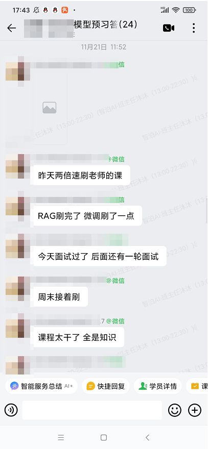 过了一段时间,这个学员的好消息就传来:“今天面试过了,后面还有一轮面试。” 但他并未松懈,而是认真计划 的周末学习课程。最有力的反馈,是他对课程内容最直白的评价:“课程太干了,全是知识。” 在信息泛滥的当下,这种“干”与“全是知识”,恰恰是对对我们智泊AI课程内容专业性、高密度、无水分的最高赞誉。