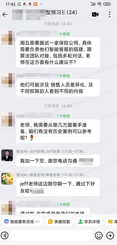 面对这样具体而紧急的职场需求,智泊AI讲师团队的响应迅速而扎实。智泊AI-Jeff老师当即表示直接进行了沟通。 琳瑶老师同步跟进,推动深度对接。这不是一次标准化的客服回复,而是智泊AI针对有个性化需求的学员专门支持,体现了我们智泊AI课程服务从“知识传递”到“问题解决”的深刻转变。