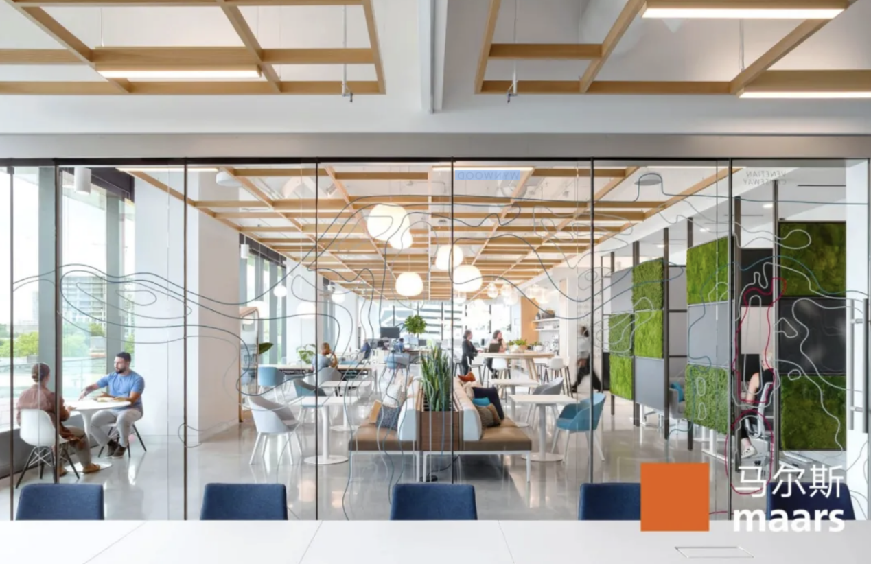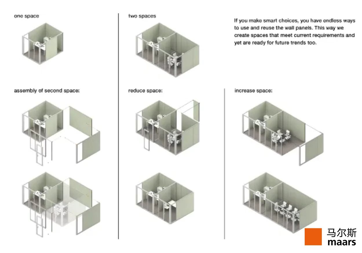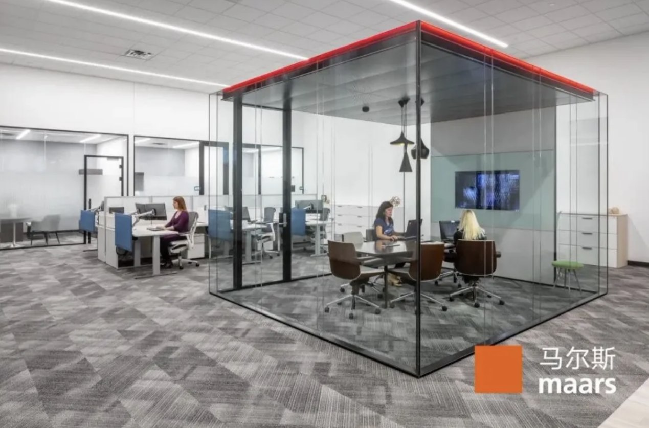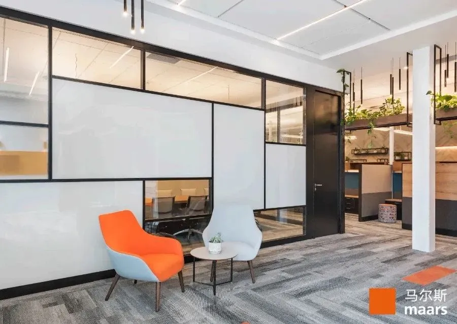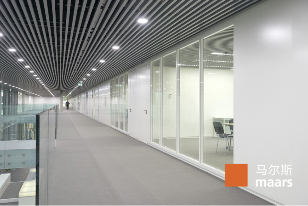 马尔斯maars模块化隔断墙以标准化、可拆装、易重组为特点,将空间划分为独立的功能单元,企业可根据人员规模、项目需求或工作模式的变化,随时调整布局。这不仅显著提高了空间利用率,也大幅减少了因搬迁、改造而产生的成本与时间消耗。相比传统装修,模块化体系更注重长期使用中的循环价值,体现了从“一次性建设”到“可持续利用”的设计转型。