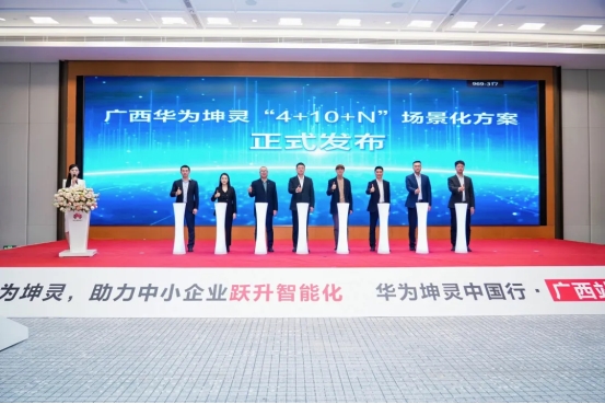 在方案发布环节,各方代表共同登台,正式发布“华为坤灵4+10+N”场景化方案,宣告华为坤灵智能化新阶段在广西的全面启航。