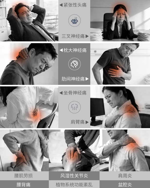 主要适用于1.神经血管神经性疾病、紧张性头痛、眩晕、三叉神经痛、枕大神经痛、肋间神经痛、坐骨神经痛的辅助治疗;2.风湿性关节炎、肩周炎、腰背痛及各种软组织急慢性损伤、肩臂痛、腰肌劳损的辅助治疗;3.植物系统功能紊乱、胃脘痛、习惯性便秘、盆腔炎、痛经、疲倦综合症疾病的辅助治疗;4.高脂血症的辅助治疗。