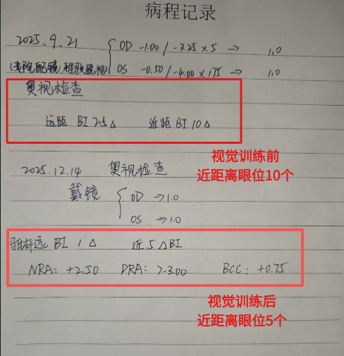 结合检查结果,柯雪冰医生为小周制定了个性化干预方案:首先为其更换适配当前视力度数的眼镜,彻底解决旧镜矫正不足、视物模糊的问题;同时,针对外隐斜和集合功能异常的视功能问题,安排了系统性的视觉训练。