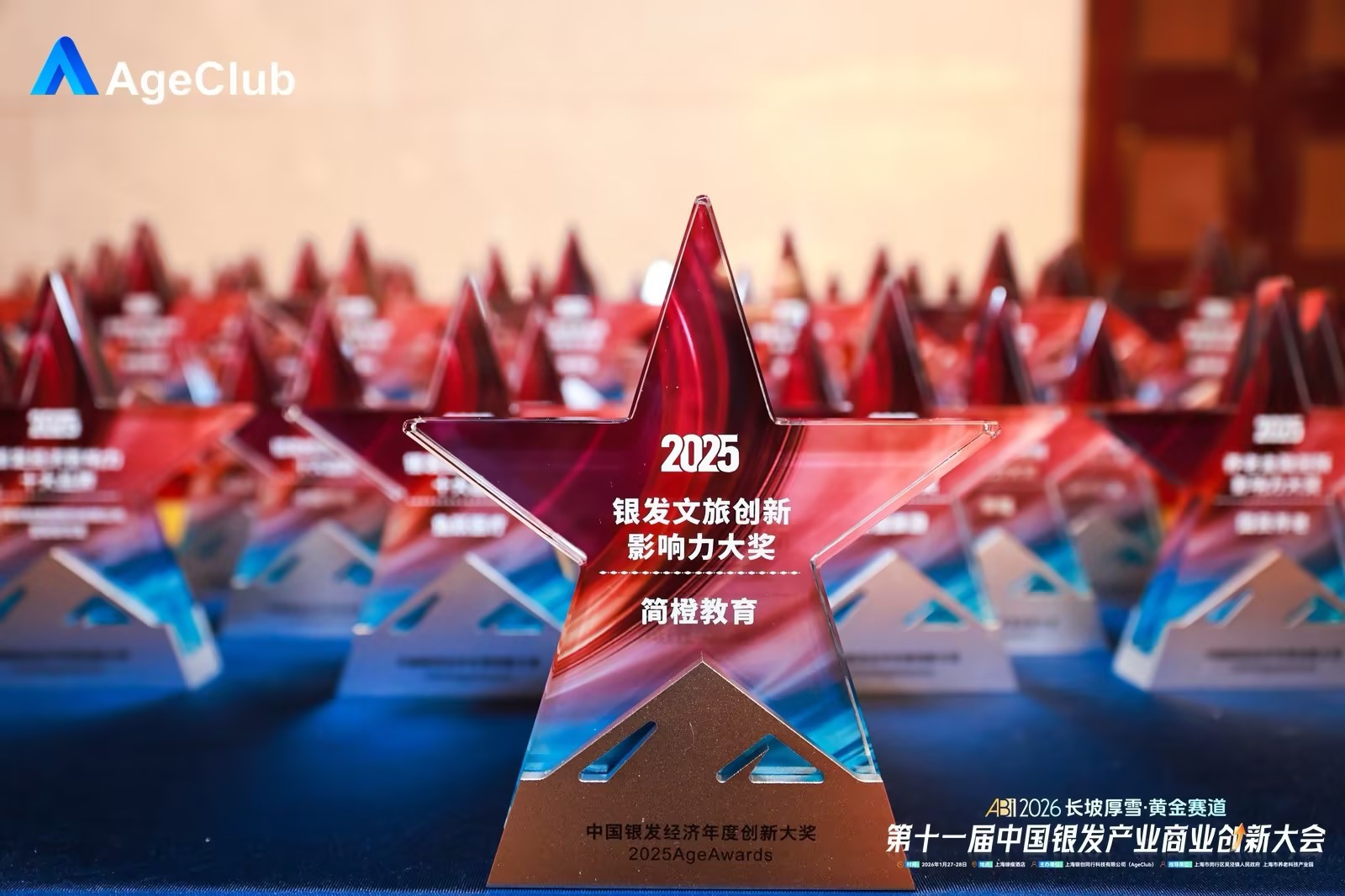 2026年1月27日,由国内领先的银发产业数据服务平台AgeClub主办的ABI2026·第十一届中国银发产业商业创新大会在上海隆重开幕。作为大会的核心环节,备受业界瞩目的“2025AgeAwards中国银发经济年度创新大奖”榜单权威发布。该奖项聚焦银发经济六大高频刚需场景,围绕营收规模、品牌影响力、社会责任、创新能力、融资金额五大维度,历时数月严格筛选,旨在表彰兼具卓越商业价值与行业引领力的标杆品牌。在激烈的评选中,简橙教育旗下品牌“简知文旅”凭借其在银发文旅领域的深度创新与实践,荣膺“2025银发文旅创新影响力大奖”,成为文旅赛道中闪耀的明星。
