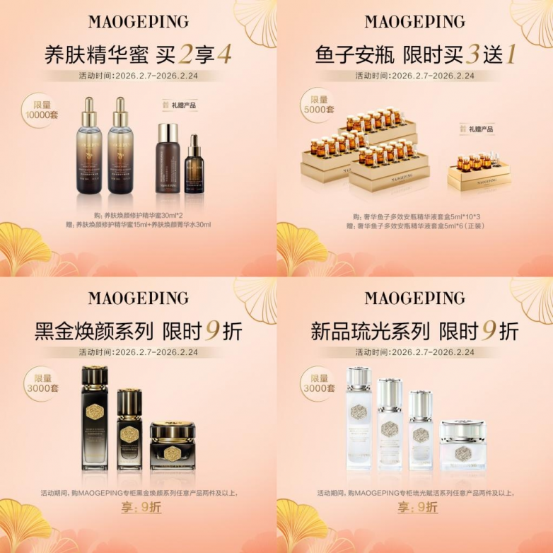 此外,活动期间,购MAOGEPING专柜黑金焕颜系列/琉光赋活系列任意产品两件及以上,享9折优惠,以高效仪式开启崭新一年的肌肤状态。