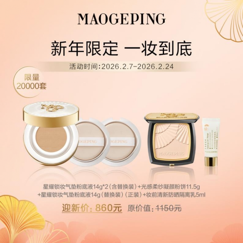 聚会聚餐,最怕底妆暗沉、脱妆。一套能持久服帖的底妆,是节日社交的“刚需”。毛戈平「星品底妆」套组,正是为此而来。这套组合由星耀锁妆气垫粉底液14g×2(含替换装)、星耀锁妆气垫粉底液14g(替换装)、光感柔纱凝颜粉饼11.5g、妆前清新防晒隔离乳5ml组成,旨在以 “轻薄持妆”与“柔焦定妆”的配合,轻松应对长时间带妆考验,让精致妆容始终在线。活动期间,这套组合仅需860元,以贴心优惠价守护冬日肌肤。