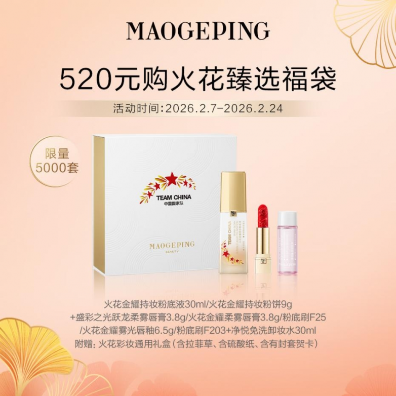 新年伊始,总需要一点惊喜和仪式感。毛戈平美妆为你准备了一份 “新春惊喜福袋” ,内含火花金耀持妆粉底液30ml/火花金耀持妆粉饼9g+盛彩之光跃龙柔雾唇膏3.8g/火花金耀柔雾唇膏3.8g/粉底刷F25/火花金耀雾光唇釉6.5g/粉底刷F203+净悦免洗卸妆水30ml。活动期间,这份福袋仅需520元,附赠火花彩妆通用礼盒,让开箱充满仪式感,是犒赏自己新年新气象的绝佳选择。
