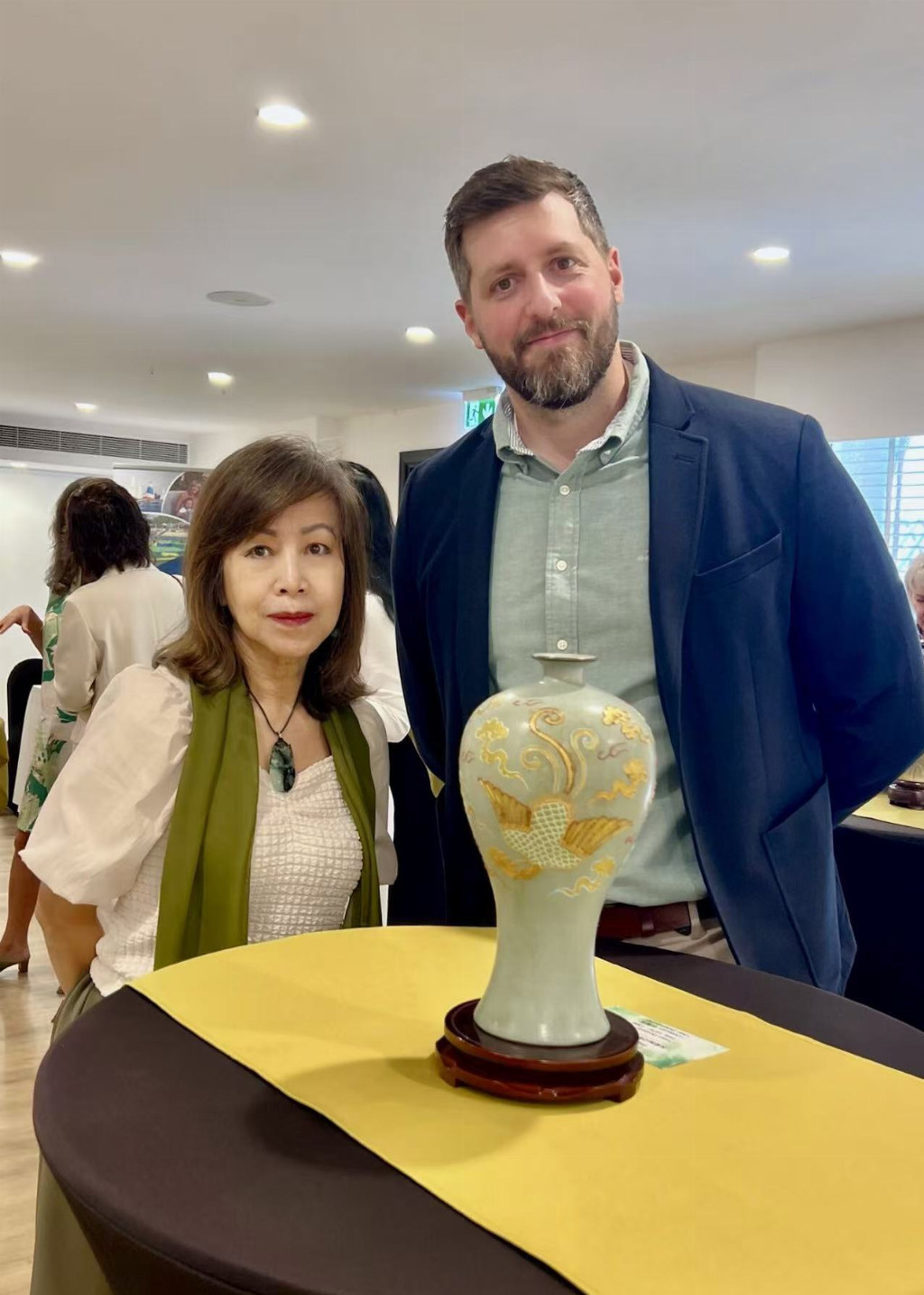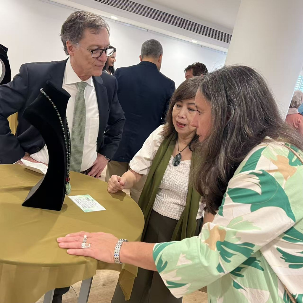 本次展览由德国中华瑰宝协会主办,并荣幸邀请到德国驻阿拉伯联合酋长国总领事兼大使夫人 Mrs. Sybille Pfaff 出席并致辞。她特意身着绿色礼服呼应展览主题,在致辞中阐述了三点重要见解:其一,她本人对绿色怀有独特偏爱;其二,她指出中东地区曾在古代陆上丝绸之路上扮演重要贸易通道的角色,因此本次以“翠色”为主题的展览在此举办尤为贴切;其三,她高度认同跨越国界与民族的文化交流活动,对跨文化对话充满支持。