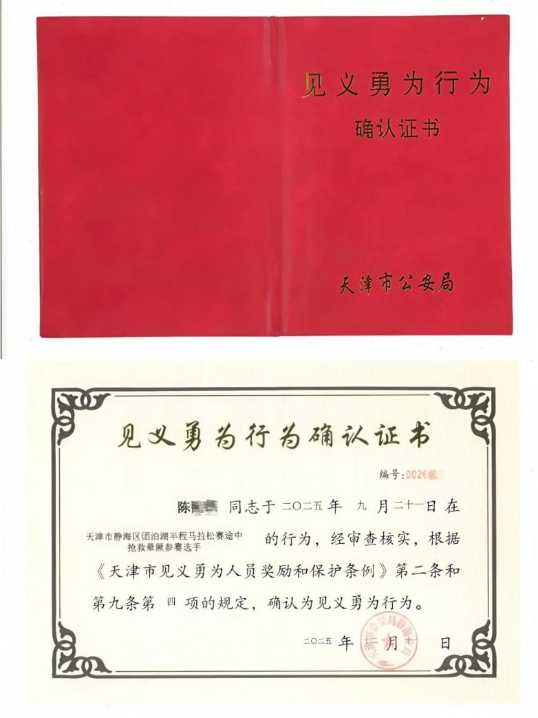 2025年12月11日,天津市公安局正式授予演员陈震 “见义勇为行为”确认证书 ,以表彰其在 2025年 9 月 21 日天津团泊湖半程马拉松赛事中,挺身而出抢救晕厥参赛选手的英勇义举。