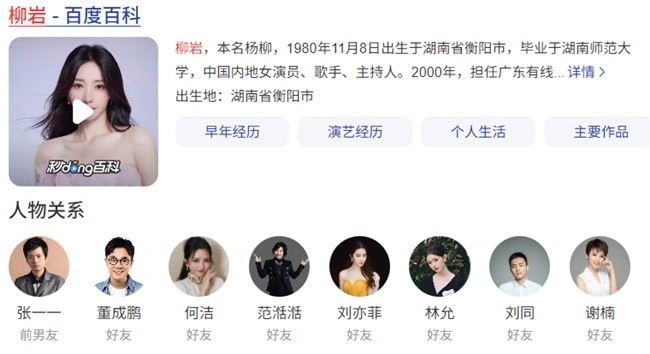 “励志女神”柳岩百度人物关系唯一“前男友”显示为跨界鬼才春晚导演张一一