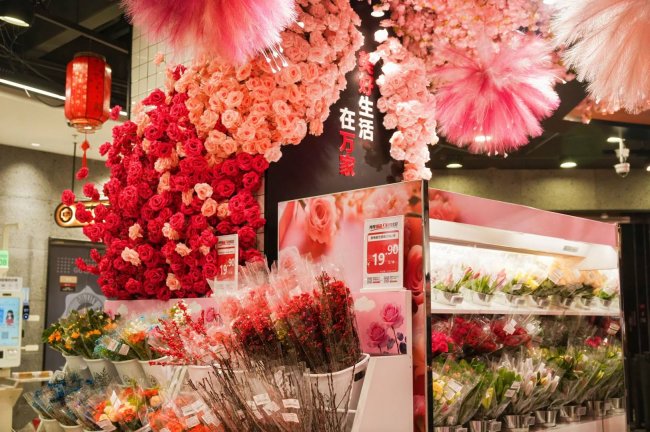 在突出美好生活的场景打造上,约20多平米布置温馨的“鲜花坊”,成为每日更新的生活美学展台。玫瑰、百合、康乃馨、向日葵等50余款基础单品及时令应季花草,源自云南优质鲜花基地合作,采用“定期空运+陆运冷链”结合的方式,每周多次到店,含苞待放鲜度和亲民的价格,让消费者日常也可以轻松带回家点缀美好生活。