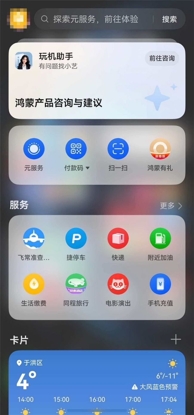 非常好找,从手机桌面向右滑动,进入华为负一屏。在顶部动态服务卡片区,就能看到“鸿蒙产品咨询与建议”卡片。要注意的是,动态卡片是轮播展示的,有时不在最上层,这时只需上下划动卡片区域,或者展开卡片列表,就能找到它啦。
