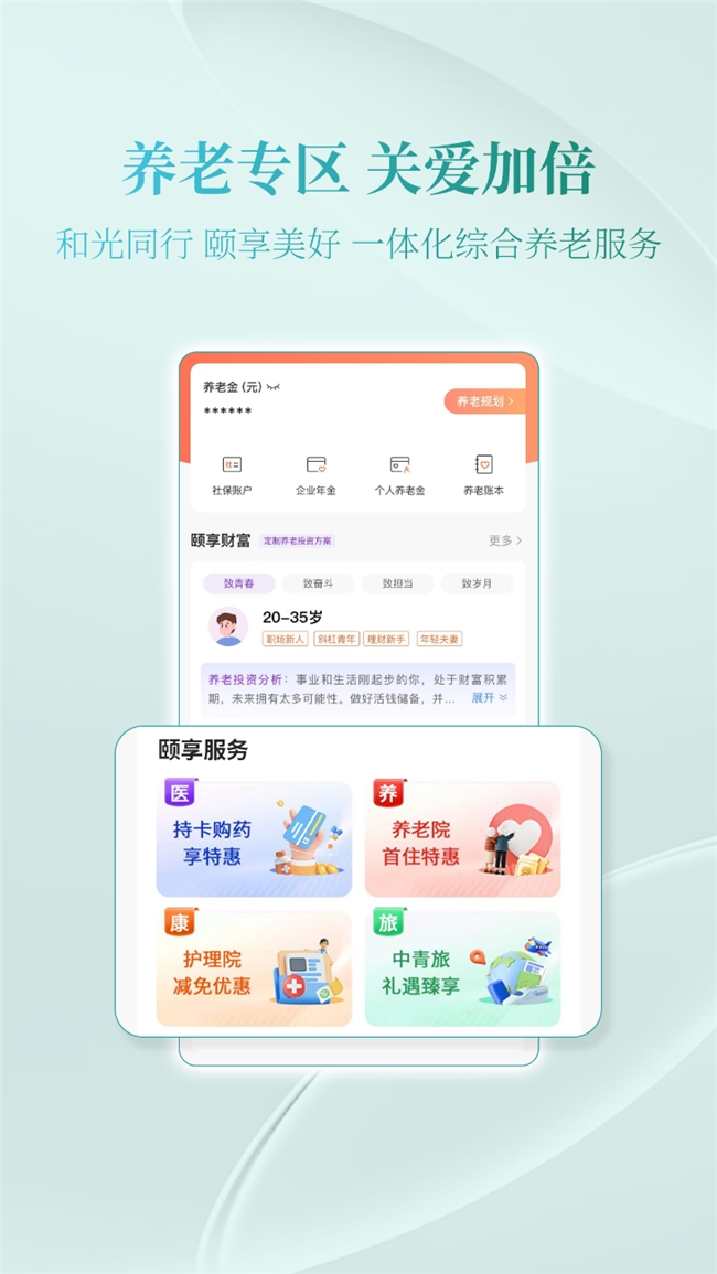 光大手机银行全面升级养老金融服务专区,为客户提供“社保、企业年金、个人养老金”三位一体综合养老金融服务。打造“颐享服务”专区,整合光大集团旗下光大养老、中青旅、嘉事堂等特色产品,提供“金融+医养康旅”光大特色专属服务。全面改版“简爱版”,化繁为简,助力银发用户乐享便捷服务。