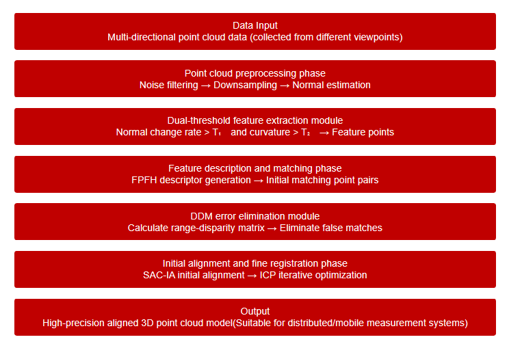 面对这一行业难题,微算法科技(NASDAQ:MLGO)提出了一种基于双阈值特征提取和距离视差矩阵(Distance Disparity Matrix, DDM)的改进点云配准算法。该算法通过双重特征阈值约束筛选高质量特征点,并结合距离视差矩阵的刚体不变性原理,实现了对错误对应点的高效剔除。经过多组实验验证,该算法在配准精度、计算效率与算法稳定性上均取得显著提升,为分布式与移动式三维测量系统提供了一种高效、精准且可扩展的配准方案。