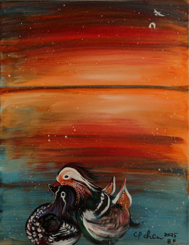 陈持平先生的丙烯画,不是绝对意义上的抽象与写实,而是介乎于两者之间。当然一千个人的心中都有一千个哈姆雷特,但透过外表看本质,我个人认为还是应该把他的画归属于“意象”范畴。尽管画中保留了一定的具象形态,但画面的背景构思与题材所采用的主观视角,却仍在告诉我,这是陈持平先生内心世界的外化呈现,甚至是带有某种时间的回溯感与空间的虚幻性。就比如说这幅《问世间情为何物》,画中他以鸳鸯隐喻情感主题,背景的夕阳带有浓厚的慢节奏感,这是独属于中国文人的意境生情,而画面的色彩主调也是趋于暖度,更为画面的审美基调增添了几分怀念味道。