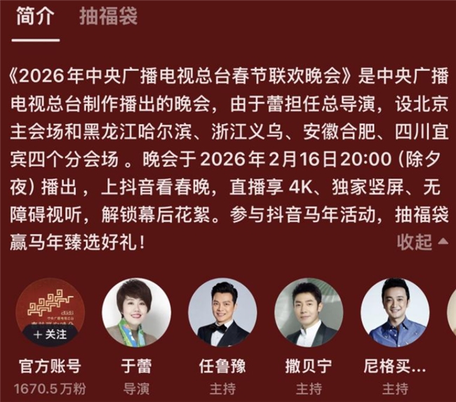 今日,抖音与中央广播电视总台《2026年春节联欢晚会》联合宣布,抖音成为2026年总台新媒体《竖屏看春晚》独家合作伙伴,将为全国观众解锁竖屏观看春晚体验。记者发现,在预约界面上,中央广播电视总台导演、撰稿人、制片人于蕾作为春晚总导演参与马年春晚创作,与昨天官宣的春晚主持人一并亮相。记者第一时间与春晚知情人士核实信息,2026马年央视春晚将由于蕾执导,她将连续四年执棒,也是近十年唯一一位连续四年执导央视春晚的总导演。