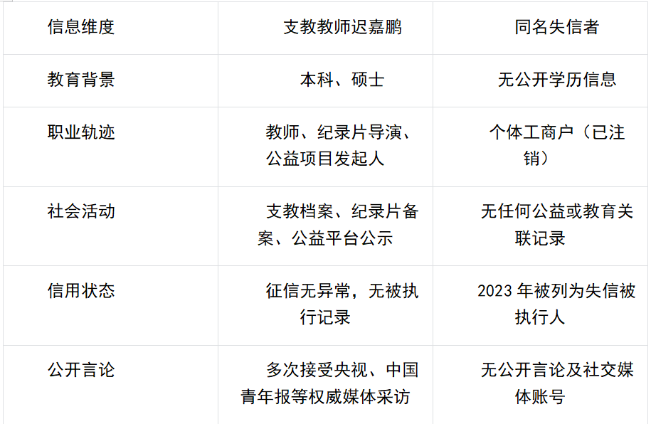 经记者向有关部门核实,真相终于水落石出:该失信记录实为另一同名同籍人士(非教育从业者)因民间借贷纠纷所致,涉诉金额 1万余元,而支教教师迟嘉鹏无任何司法涉诉记录,征信中心 2026年 1 月出具的征信报告明确显示 “无不良信用记录”。