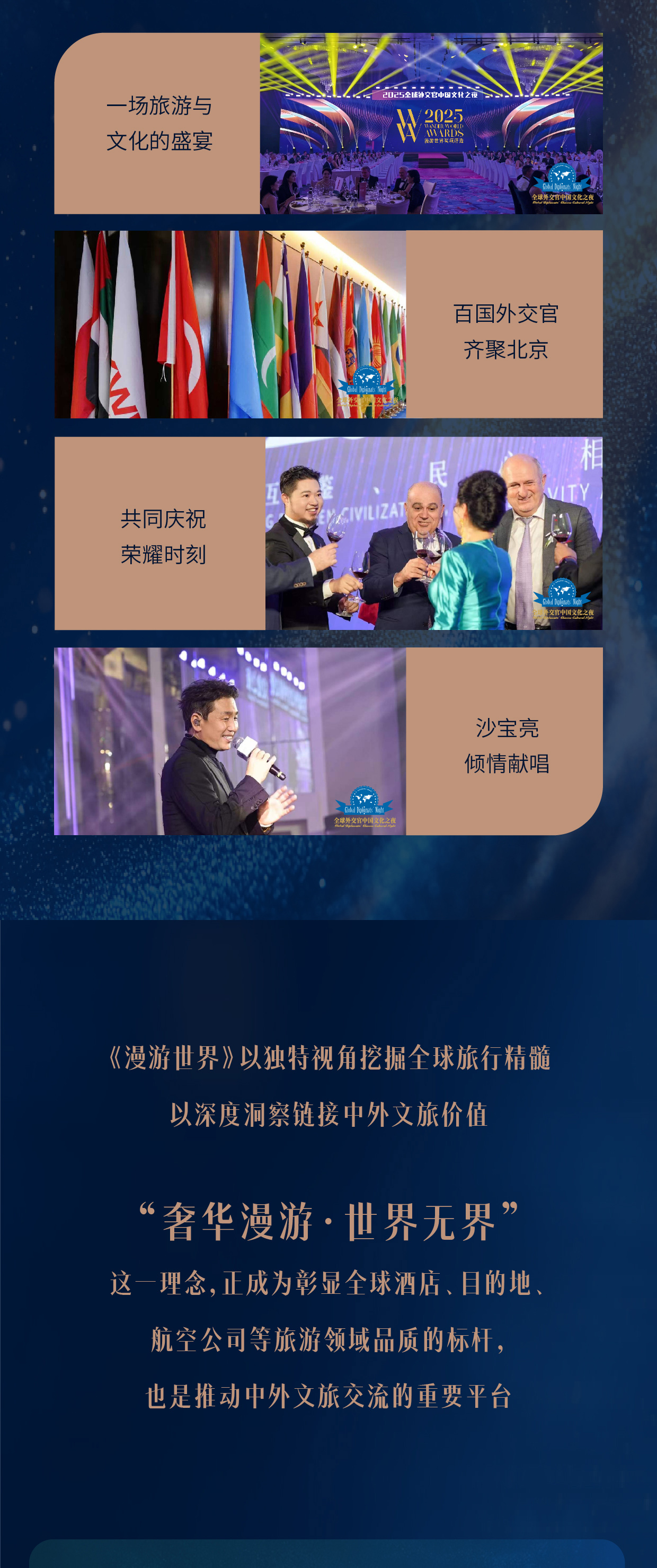 由《漫游世界》杂志与「全球外交官中国文化之夜」联合呈现的年度奖项评选,立足全球高端旅游与生活方式领域,旨在甄选在目的地魅力、旅居体验与文化表达方面具有标杆意义的杰出代表。奖项以国际视角与文化深度为核心,关注旅行如何成为连接不同国家、城市与文明的纽带,不仅呈现卓越品质,更强调交流价值、可持续理念与时代精神。