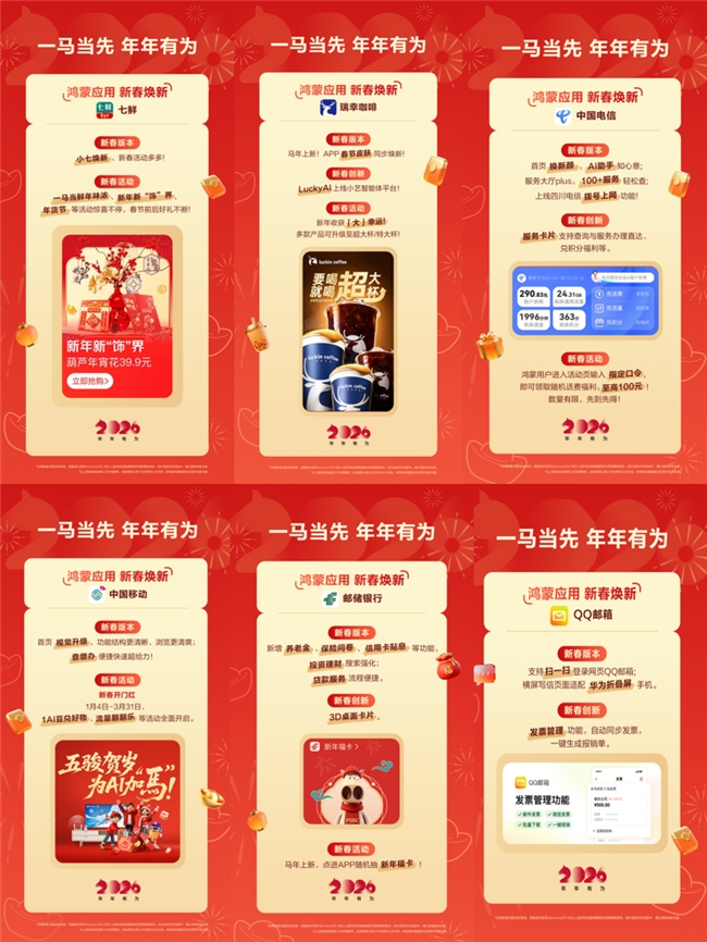 你的鸿蒙手机正在疯狂暗示:马年“电子年货”已到货!数千款鸿蒙应用开启新年狂更模式,海量新春活动、创新特性玩法、全新版本功能上线。从社交互动到宅家娱乐,从春节出行到智慧带娃,甚至与好友组队开黑…多场景全覆盖,这波春节鸿蒙应用体验夯爆了!