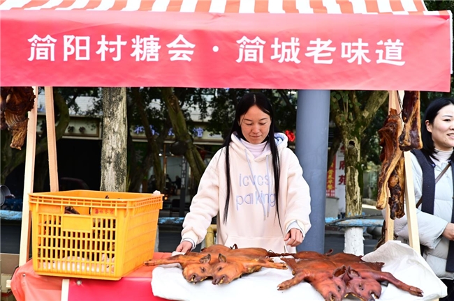 “这腊肉,还是小时候那股柴火熏的香味儿!”在简阳市简城街道“简阳村糖会·简城老味道”特色促消费活动现场,一位头发花白的老大爷捧着刚买的腊肉,满是感慨地对身旁的家人说道。2026年2月5日下午,在简州书院旁的广场上热闹非凡,一场充满乡土情怀的市集与联欢活动在此圆满举行,为居民们烹制出一场最地道的年味盛宴,也为乡村振兴注入了新的活力。