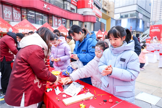 市民带着孩子在非遗文化体验区体验捏面人、剪窗花等传统技艺,感受传统文化魅力。