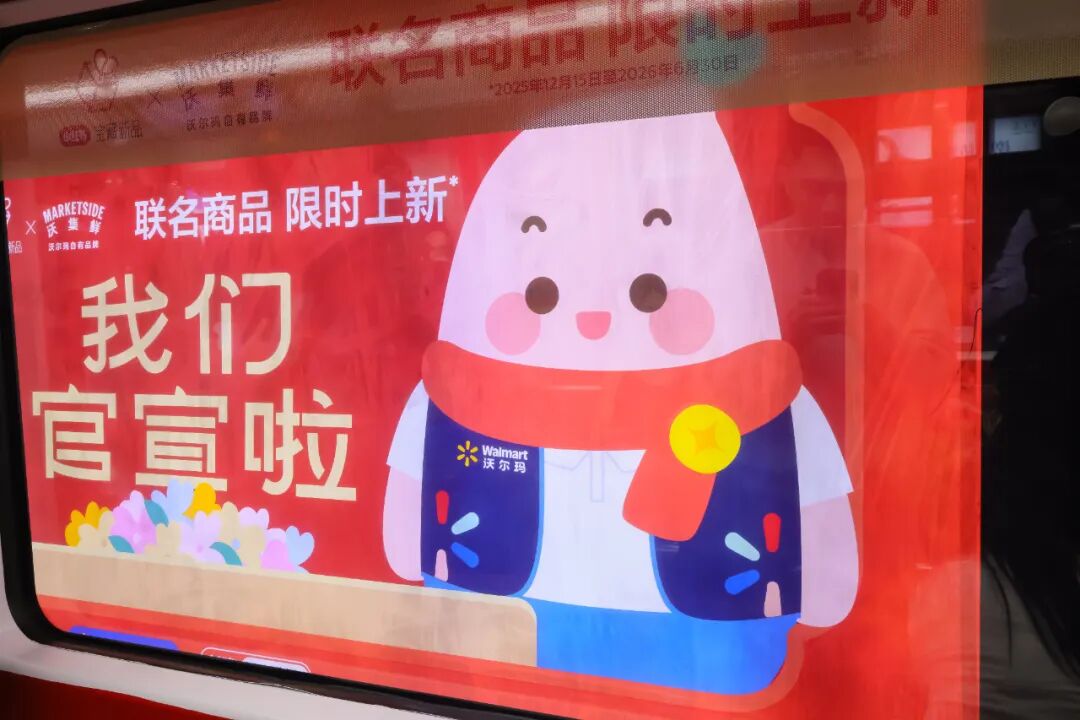 以本次蛇口店开业为例,沃尔玛在深圳、上海都投放了极具沉浸感的灯箱联排广告。通过车厢内部画面与站台灯箱形成的连环画效果,门店成为了内容发生地,而公共空间则成了情绪的延伸带,实现了从消费场景到更广阔场景的全面覆盖。