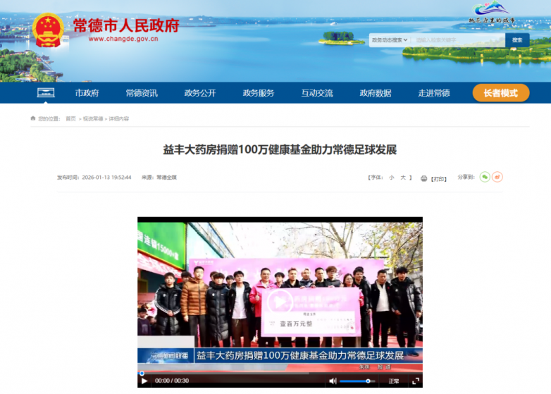 在常德举办的“湘超燃动活力 益丰守护安康”公益活动中,益丰向“湘超”常德足球队捐赠100万元健康基金,专款用于球队运动健康保障与本地基层足球事业发展,以实际行动践行回馈乡土、助力体育事业的企业担当。活动现场,益丰专业药师团队还为市民与球迷提供免费健康检测与咨询服务,实现健康服务与体育场景的深度融合。