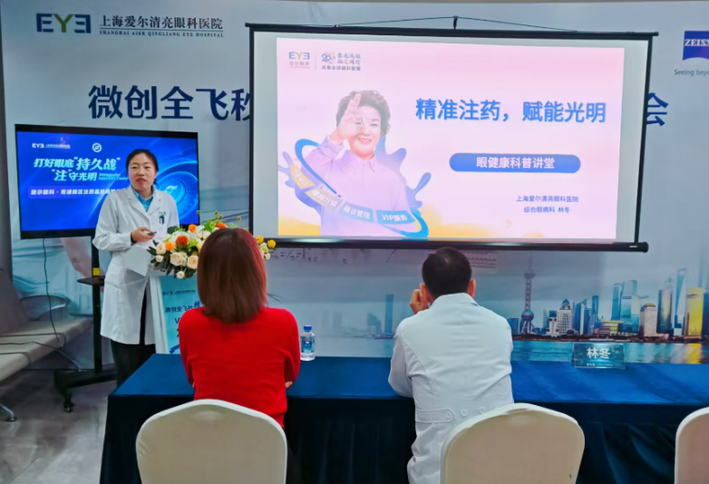 上海爱尔清亮眼科医院CEO苏怡、院长李文生、综合眼病科副主任林冬出席活动。医院CEO苏怡、院长李文生、综合眼病科副主任林冬共同为“眼内注药基地”揭牌。随后,林冬主任为大家作了题为《精准注药,赋能光明》的专题讲座。